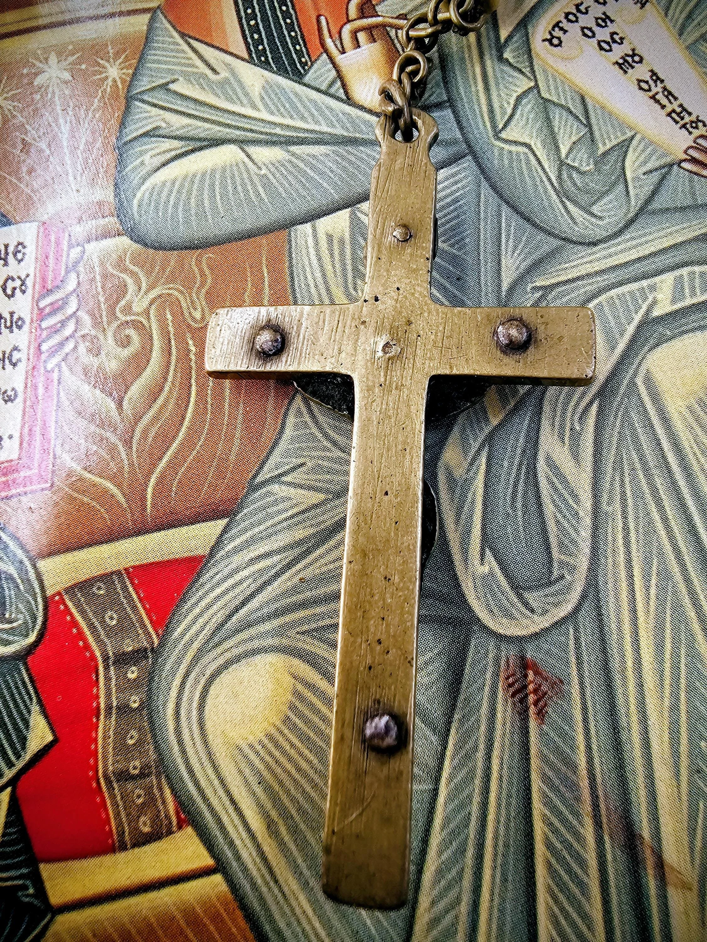 Crucifix: A riveted, hand-assembled brass crucifix sandwiches a black insert (vulcanite/enamel/ebonized wood) beneath a cast corpus with radiant halo—an old French workshop build that has practically vanished.