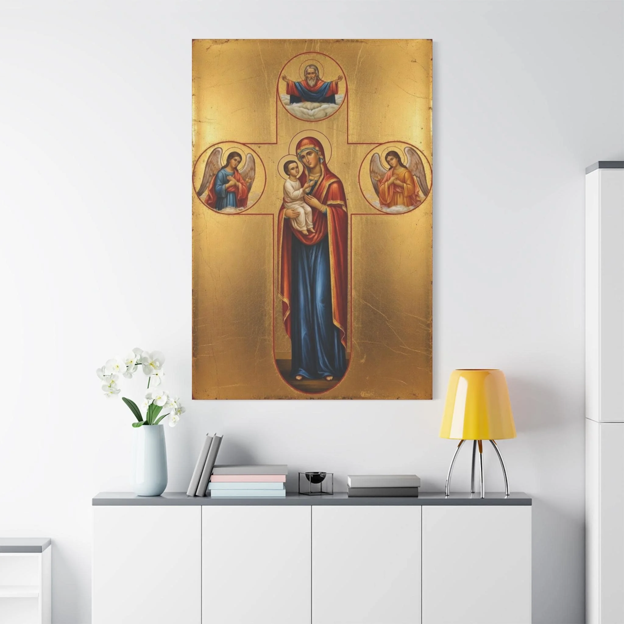 Printed on premium canvas, this piece carries the visual language of sacred iconography while offering a modern presentation suitable for home prayer corners, bedrooms, living rooms, offices, and church spaces. Every detail preserves the traditional gold background, sacred symbolism, and timeless composition of the original icon.