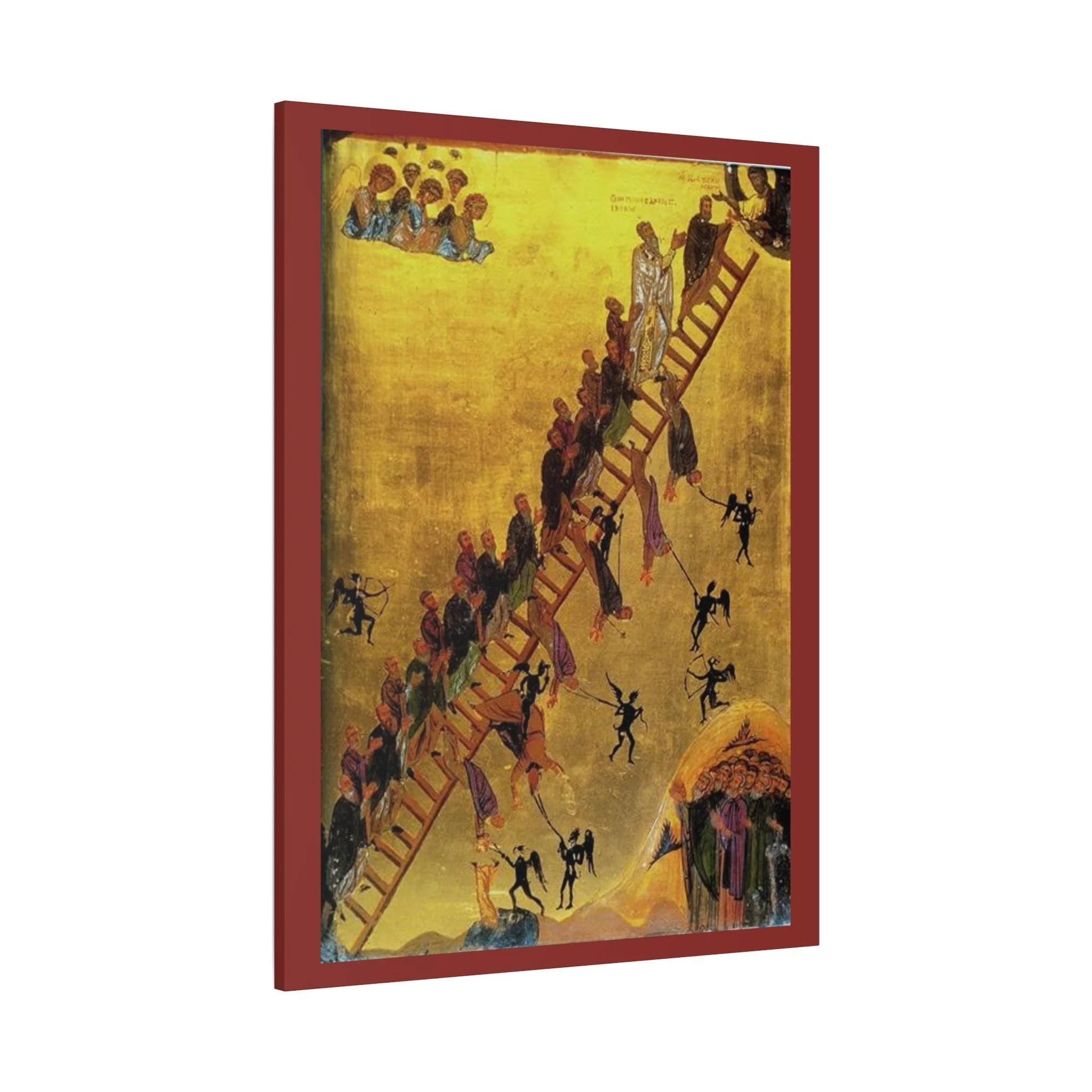 This striking Ladder of Divine Ascent icon canvas is inspired by one of the most profound and sobering images in Christian spirituality. Rooted in the teachings of St. John Climacus, this icon visually expresses the lifelong journey of the soul toward God — a path of struggle, repentance, grace, and divine mercy.