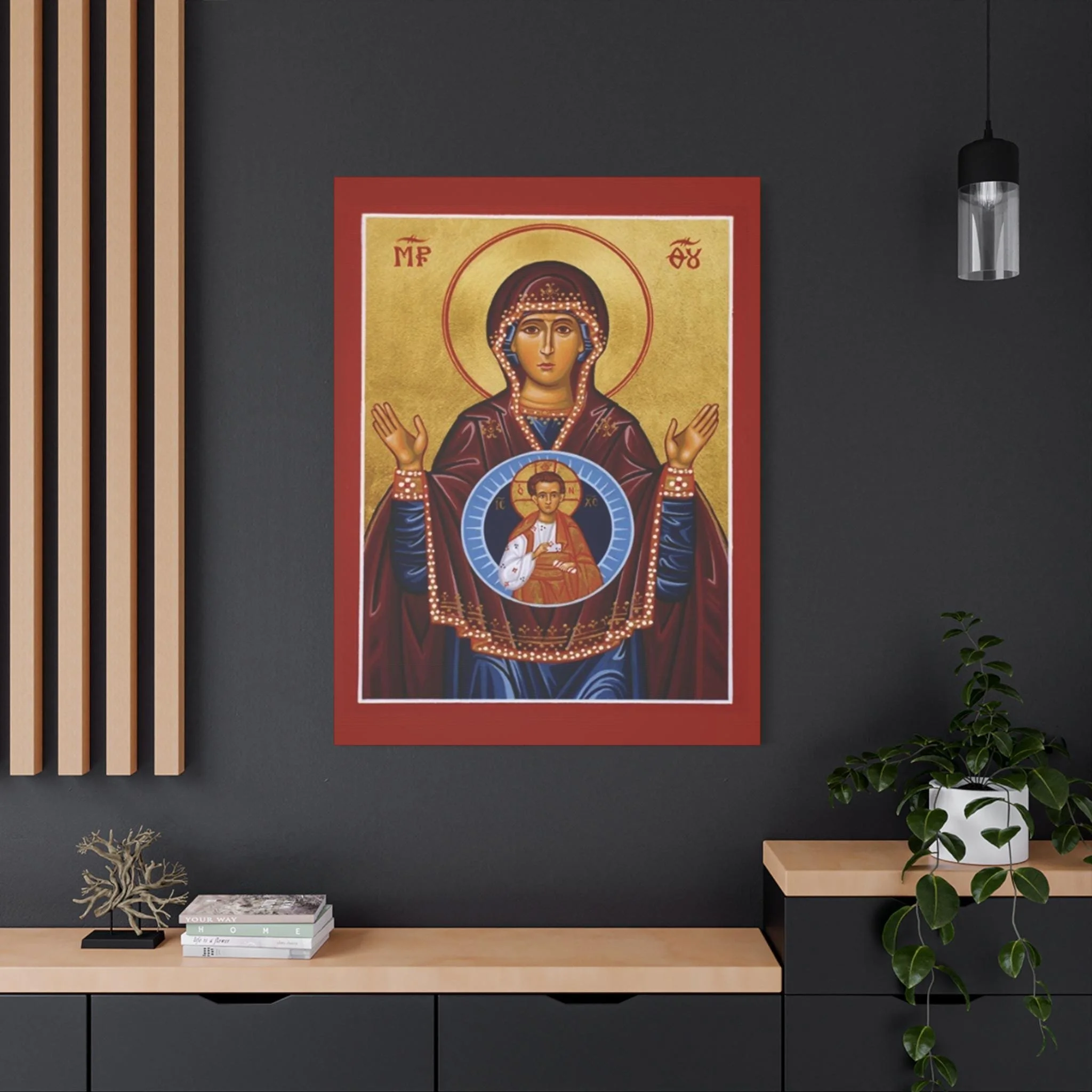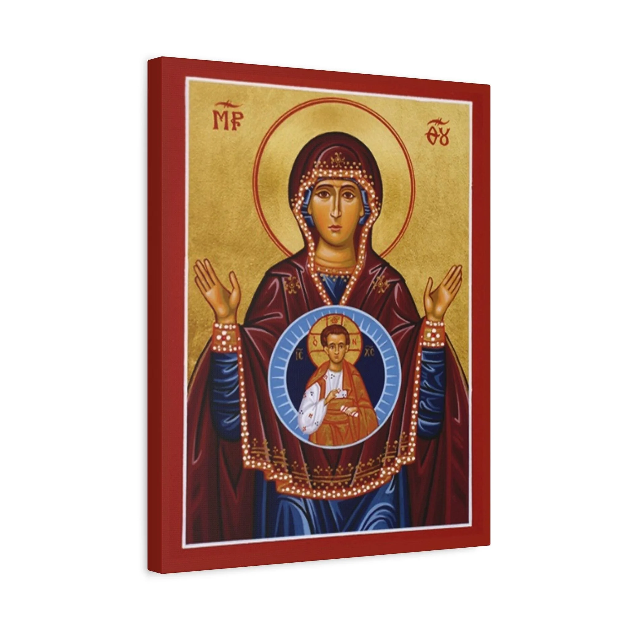 Discover an extraordinary piece of sacred Christian art with this stunning “More Spacious Than the Heavens” icon canvas. Inspired by the ancient Byzantine iconographic tradition, this piece portrays the Theotokos (Mother of God) in the timeless Platytera style — a deeply theological image treasured in Eastern Orthodox and Eastern Catholic spirituality.