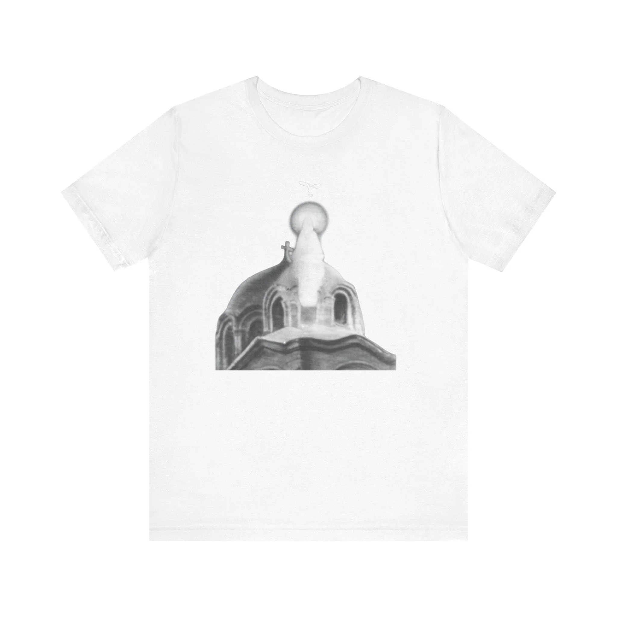 Celebrate one of the most profound miracles of the 20th century. In 1968, the Virgin Mary appeared atop the domes of St. Mary's Church in Zeitoun, Cairo. Witnessed by millions—Christians and Muslims alike—she appeared as a silent, glowing figure of light surrounded by ethereal doves. This shirt captures that iconic silhouette, serving as a wearable icon of peace and divine presence.