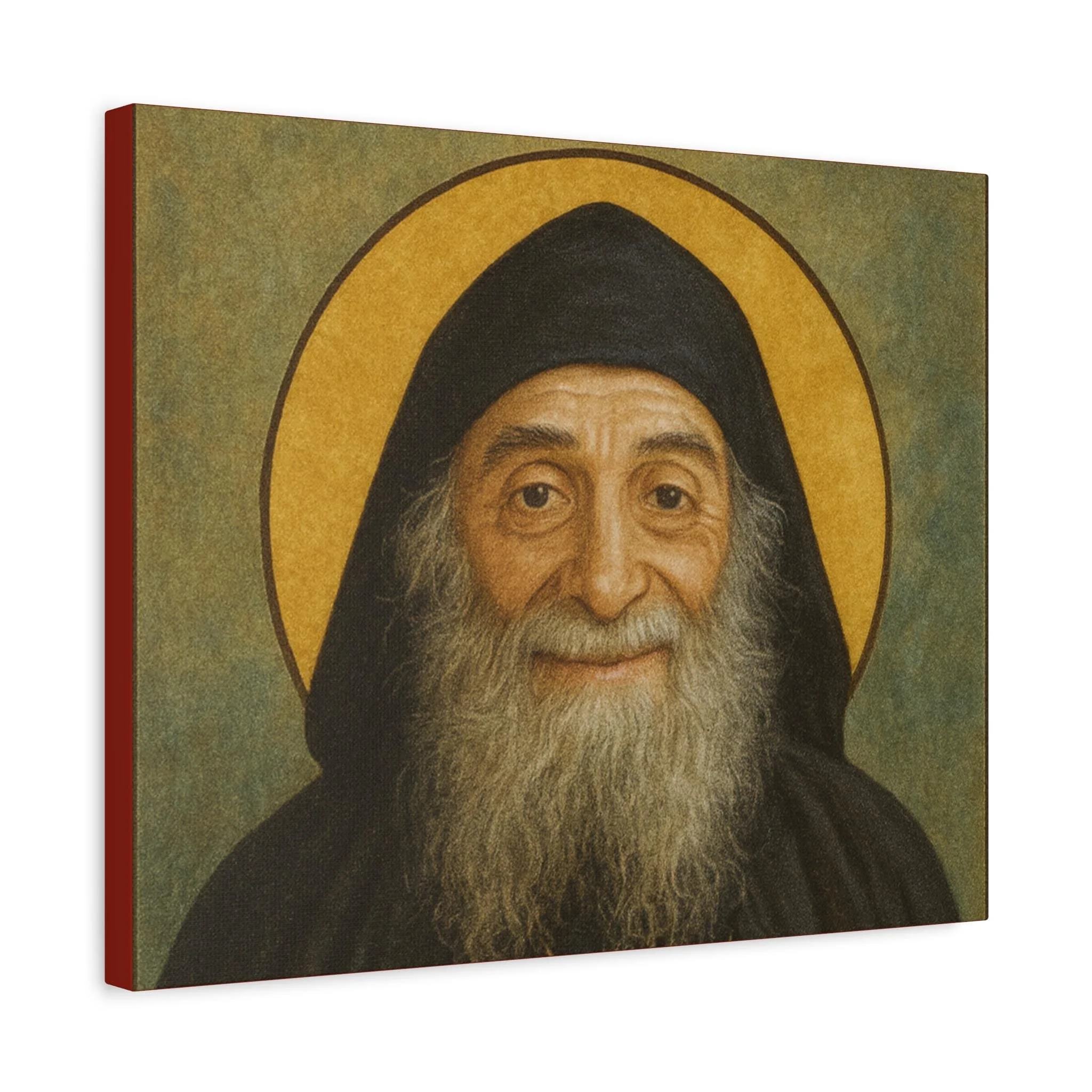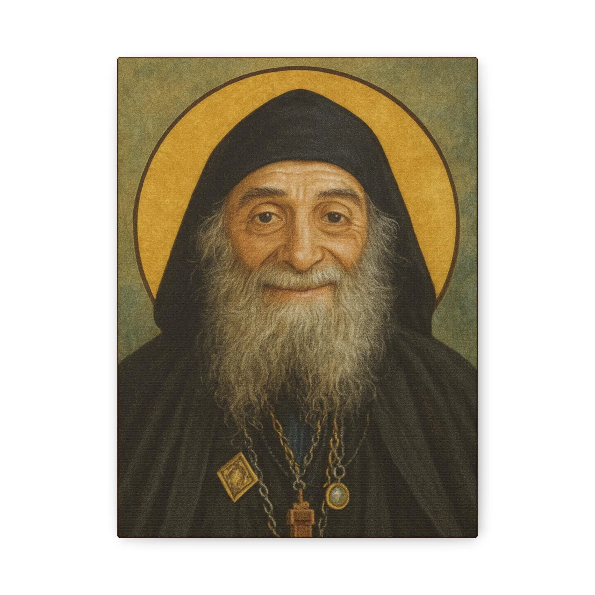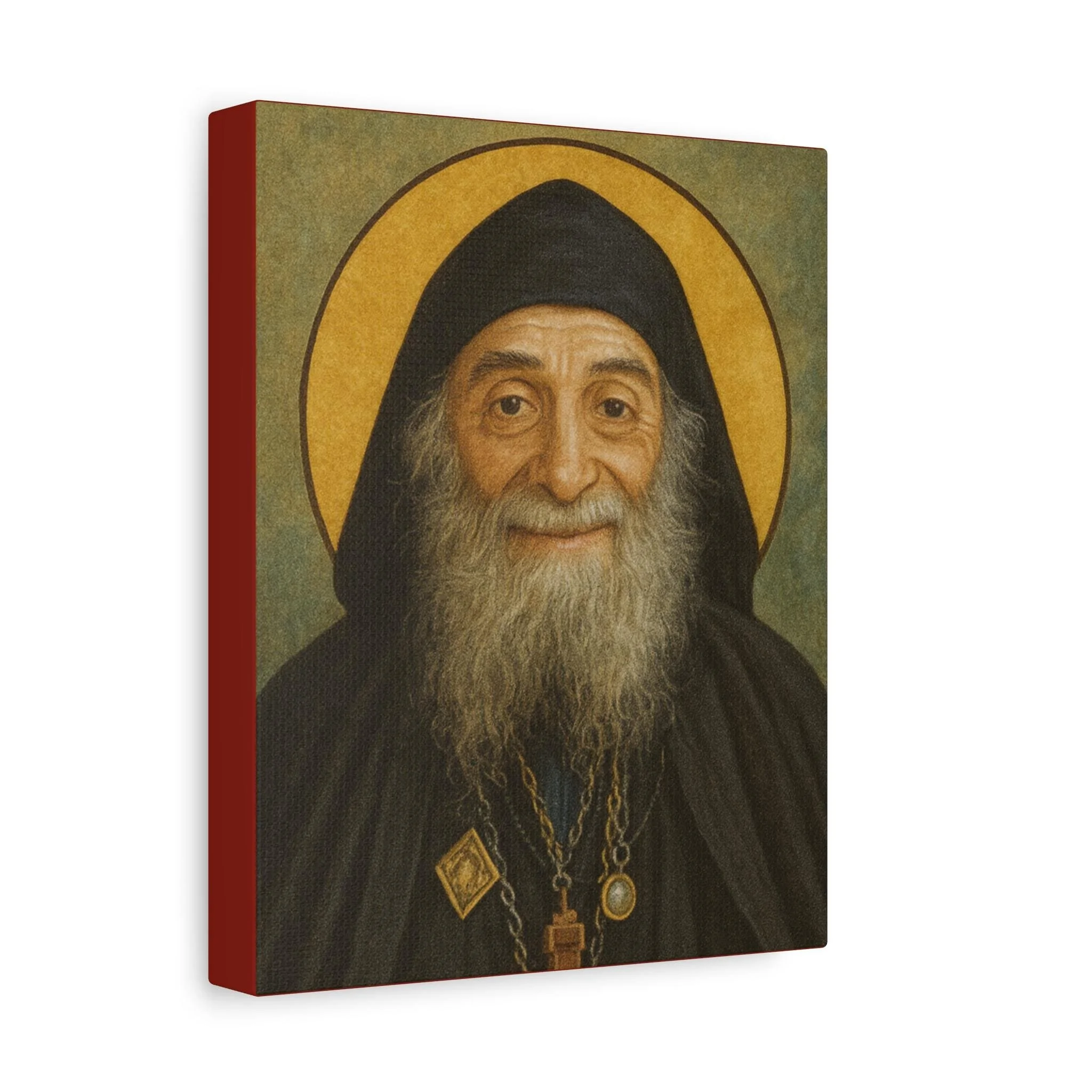 This canvas features Saint Gabriel of Georgia, one of the most beloved Orthodox saints of the modern era, known as a Fool for Christ.