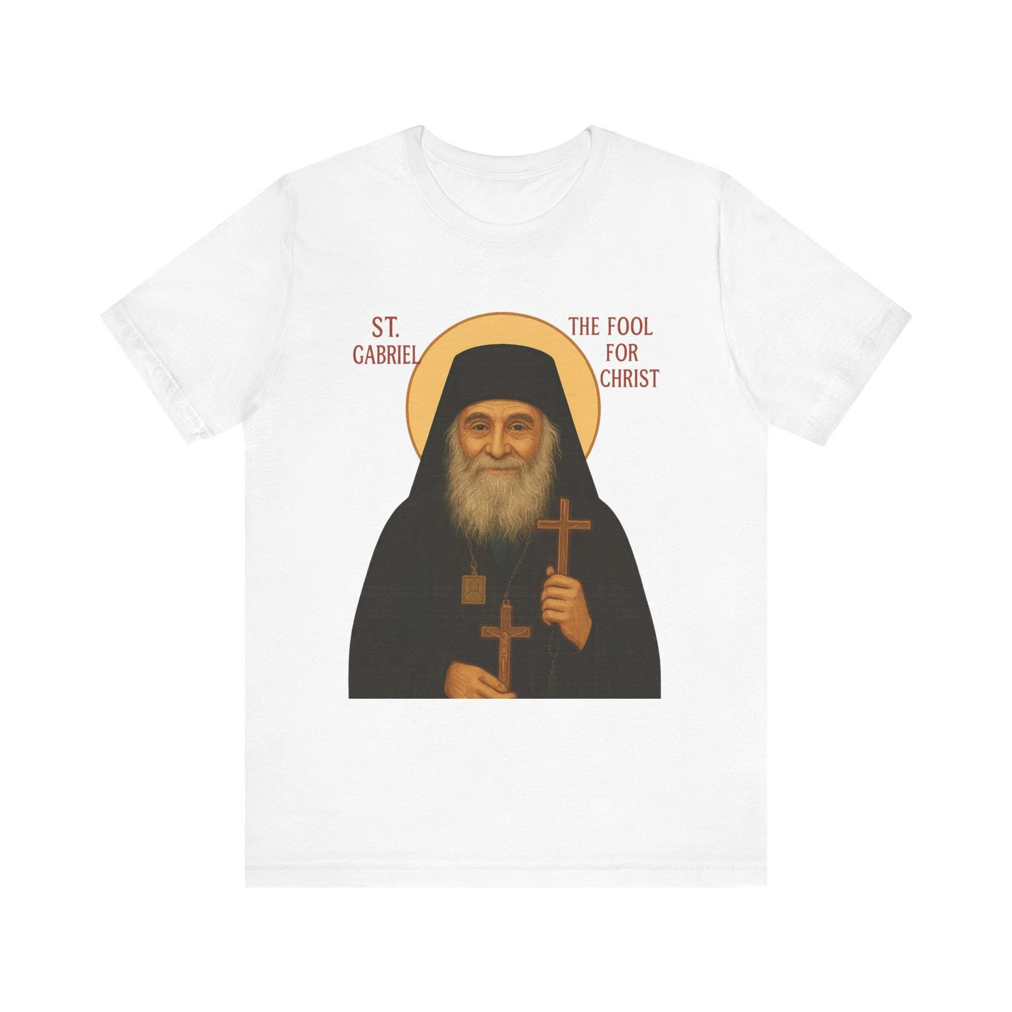 Honor one of the most beloved modern saints with this Saint Gabriel the Fool for Christ shirt. Featuring a reverent icon-style image with a golden halo, this Orthodox Christian and Catholic t-shirt is perfect for anyone who draws inspiration from Saint Gabriel's life of humility, joy, and holy foolishness.