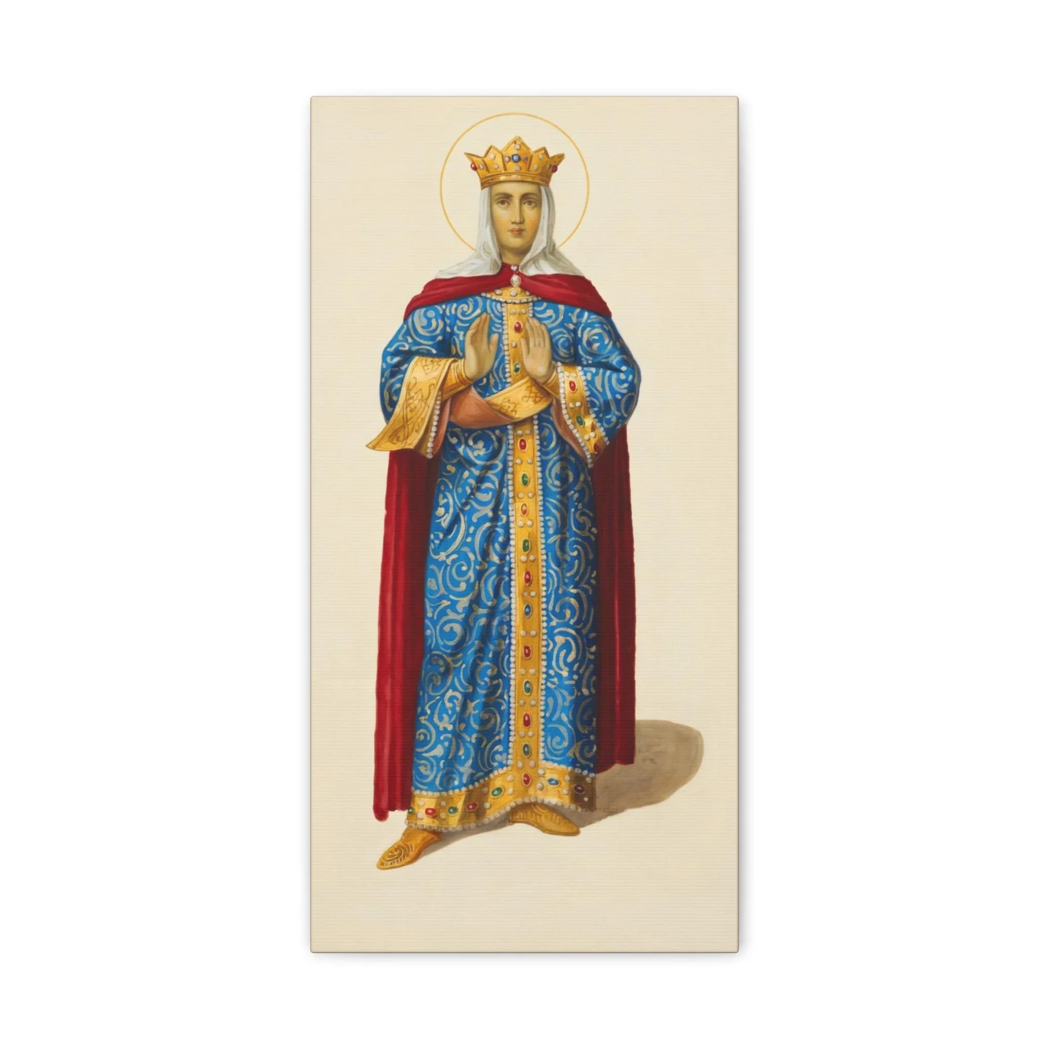 This beautiful traditional icon depicts her in regal Byzantine-style attire — a richly jeweled blue gown with golden accents, red mantle, and crown — with hands raised in prayer and a serene, noble expression. Printed on premium gallery-wrapped canvas with fade-resistant archival inks, it arrives ready to hang and makes a stunning focal point for any prayer space, home altar, or Orthodox/Catholic interior.